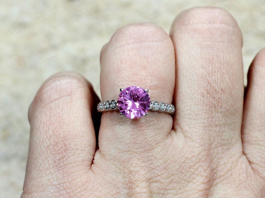 Vintage Pink Sapphire & Diamonds Engagement Ring Bezel Milgrain Smooth Round Ferarelle 2ct 8mm Custom Wht-Yellow-Rose Gold-14k-18k-Plat