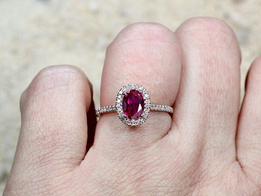 1ct Ovale 7x5mm Ruby Oval Halo Engagement Ring,Petite Basket Diamond