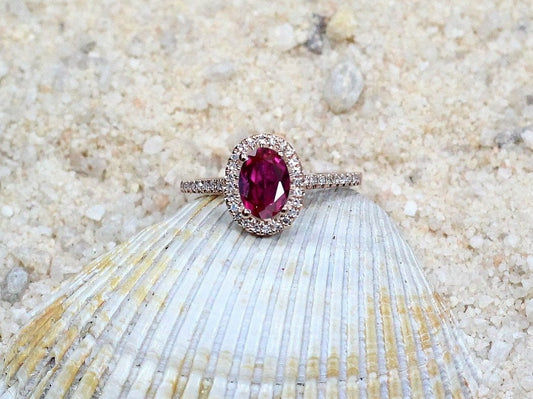 1ct Ovale 7x5mm Red Ruby & Diamonds Oval Halo Engagement Ring