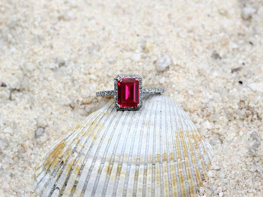 2ct Hemera 6x8mm Ruby Emerald Cut Engagement Ring & Diamond Halo Ring