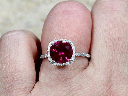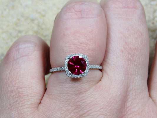 Ruby & Diamonds Engagement Ring Cushion Halo Cuscino Grand 2ct 8mm Custom Size White Yellow Rose Gold 10k 14k 18k Platinum