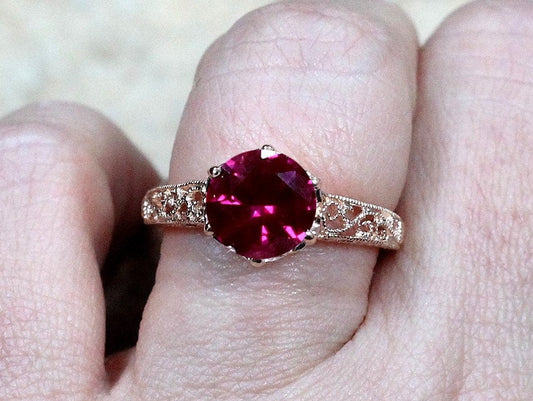 Vintage Ruby Engagement Ring Polymnia Antique Filigree Round 2ct 8mm Custom White-Yellow-Rose Gold-10k-14k-18k-Platinum