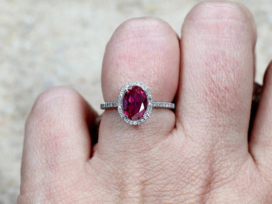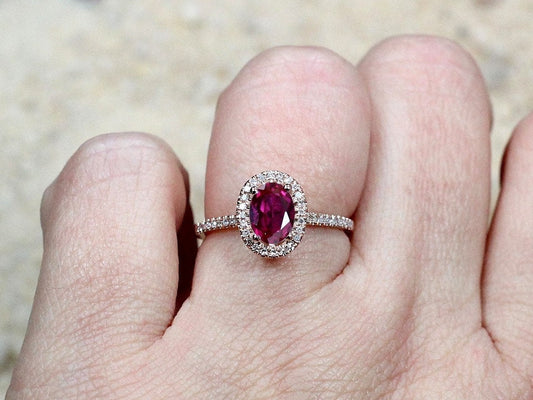 Ruby & Diamonds Engagement Ring Oval Halo Ovale Petite Basket Diamond 1ct 7x5mm Custom Size White-Yellow-Rose Gold-10k-14k-18k-Platinum