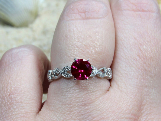 Ruby Engagement Ring Antique Style Vintage 4 Prong Filigree Round Andromeda 2cts 8mm Custom White-Yellow-Rose Gold-10k-14k-18k-Plat
