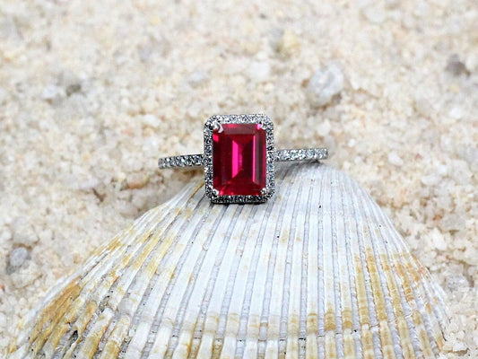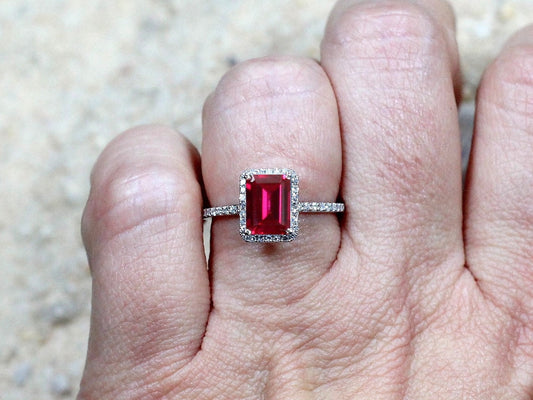 Red Ruby Engagement Ring, Diamonds Halo, Emerald cut, Ione, 2ct, 8x6mm, Promise Ring, Gift for her