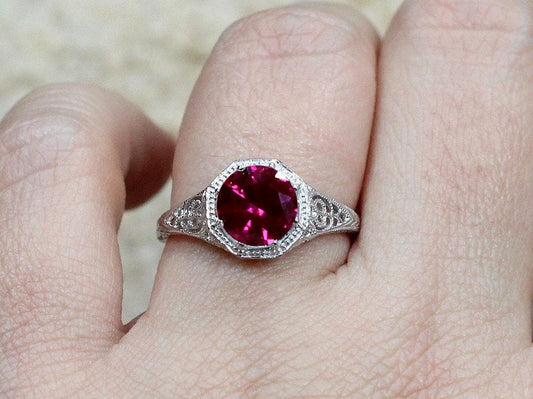 Ruby Vintage Antique Filigree Miligrain Engagement Ring Round cut Fides 2ct 8mm Custom size White-Yellow-Rose gold 10k-14k-18k-Platinum