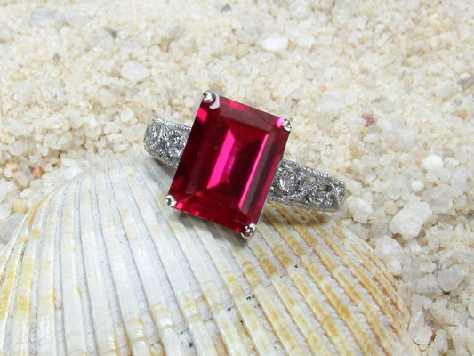 Red Ruby & Diamonds Engagement Ring, Polymnia, Filigree, Milgrain, Vintage, Antique, 10x8mm, 4ct, Emerald Cut