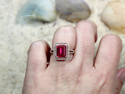 Ruby & Diamonds Double Halo Engagement Ring Emerald Belus Grand 4ct 10x8mm Custom Size White-Yellow-Rose Gold-10k-14k-18k-Platinum