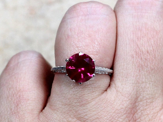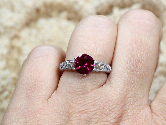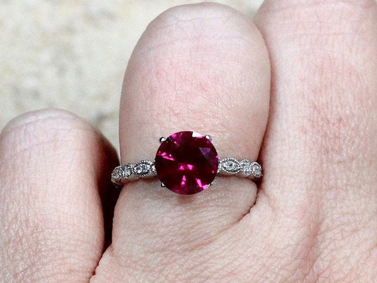 Ruby Engagement Ring Polymnia Antique Filigree Round Vintage 2ct 8mm Custom White-Yellow-Rose Gold-10k-14k-18k-Platinum
