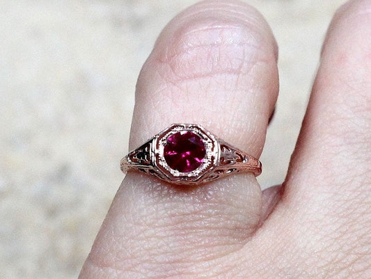 Ruby Engagement Ring, Vintage, Antique, Filigree, Round cut, .75ct, 5mm, Kassandra