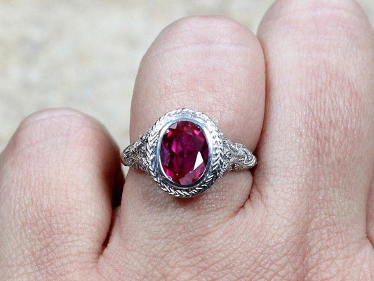 Ruby Engagement Ring, Vintage, Oval, Antique, Bezel Set, Chevron, Filigree, Kore, 3ct, 9x7mm