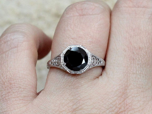 Black Spinel Vintage Round cut Filigree Miligrain Engagement Ring Antique Fides 2ct 8mm,BellAmoreDesign