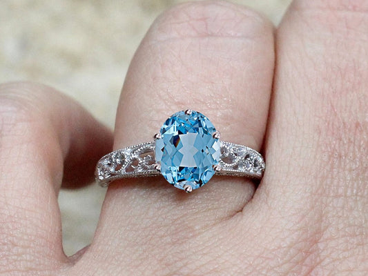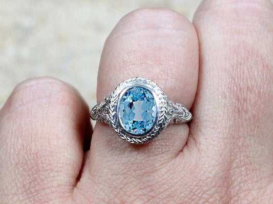 Light Blue Spinel Vintage Engagement Ring Oval Antique Style Bezel Set Chevron Filigree Kore 3ct 9x7mm White-Yellow-Rose Gold-10-14k-18k-Plt