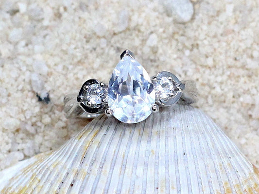 1.75ct Mira 9x7mm White Sapphire 3 Gemstone Pear Cut Engagement Ring