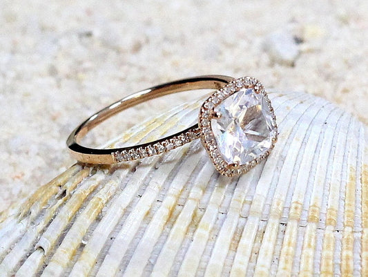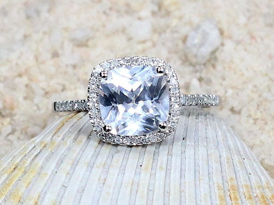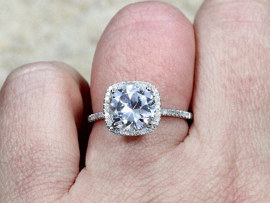 3ct Cuscino 8mm White Sapphire Engagement Ring, Diamonds Cushion Halo