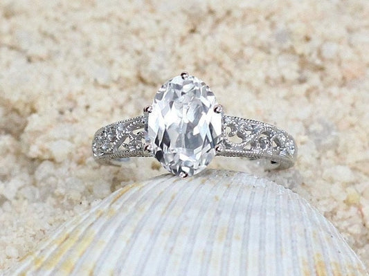 Vintage White Sapphire Engagement Ring Oval Antique Style Filigree Milgrain Polymnia 3ct 9x7mm White-Yellow-Rose Gold-10k-14k-18k-Plat