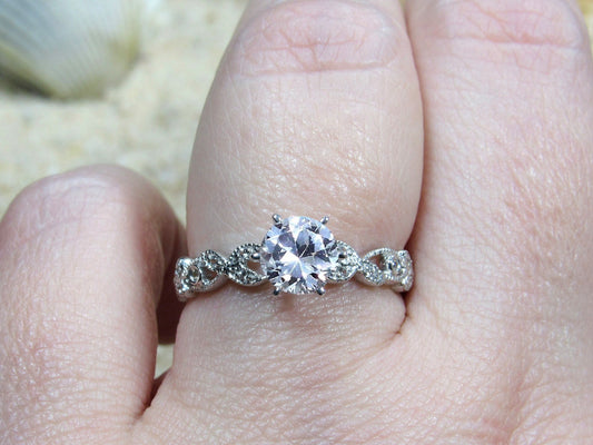 White Sapphire & Diamonds Engagement Ring Leaf Milgrain Beaded Edge Round Gaia 1ct 6mm Custom White-Yellow-Rose Gold-10k-14k-18k-Platinum