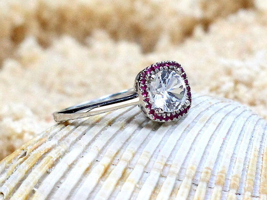 1ct Doris 6mm White Sapphire Engagement Ring, Ruby Cushion Halo