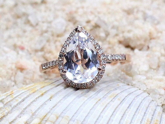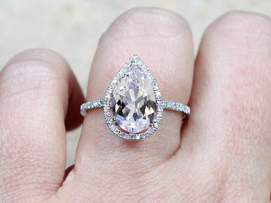 White Sapphire Engagement Ring & Diamond Pear Halo Helena 1ct 7x5mm Custom Size White-Yellow-Rose Gold-10k-14k-18k-Platinum