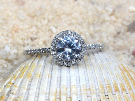 White Sapphire Engagement Ring, Round Diamonds Halo, Pricus, 1ct, 6mm, Promise Ring, Gift For Her