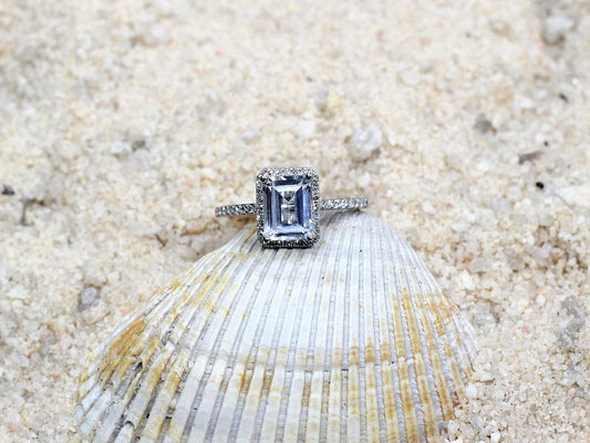 2ct Hemera 8x6mm White Emerald Cut Sapphire Engagement Ring & Diamond Halo