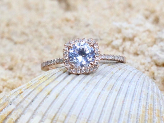 White Sapphire Diamond Engagement Ring Cushion Halo Cuscino Petite 1ct 6mm Round Custom Size White-Yellow-Rose Gold-10k-14k-18k-Platinum