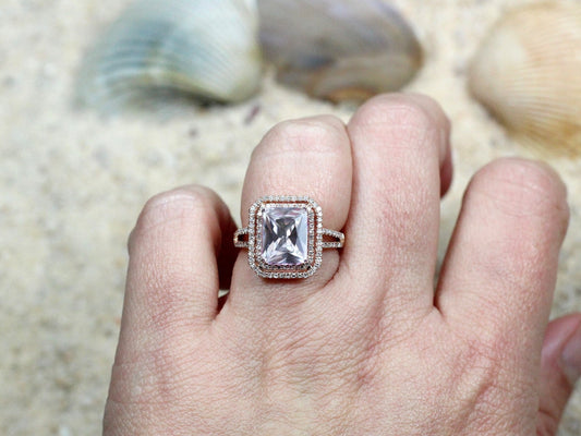 White Sapphire & Diamonds Engagement Ring Emerlad Double Halo Belus Grand 4ct 10x8mm Custom White-Yellow-Rose Gold-10k-14k-18k-Plat