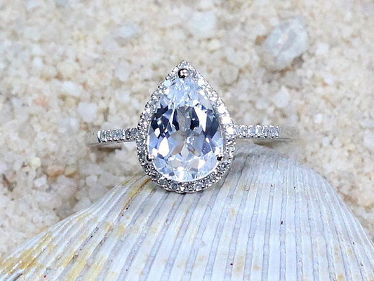 White Sapphire Diamonds Engagement Ring Pear drop Cut Halo Goccia Grand 2.5ct 10x7mm Custom Size White-Yellow-Rose Gold-10k-14k-18k-Platinum