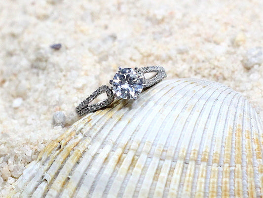 White Sapphire & Diamonds split shank Engagement Ring Solitaire round Aglaia 1ct 6mm Round White-Yellow-Rose Gold-10k-14k-18k-Platinum