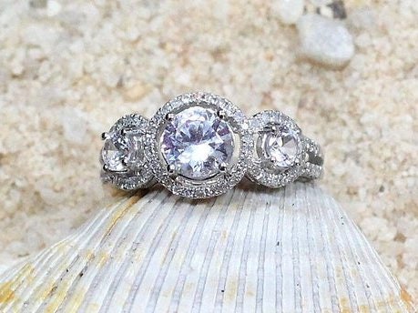 White Sapphire Engagement Ring, 3 Stone, triple Round Halo, split shank, Euryale, 1ct, 6mm, Gift for her, Promise ring