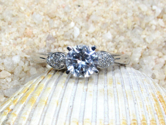 White Sapphire Engagement Ring, Round Diamonds Cluster Leaf Ring, Hestia, 1ct, 6mm, Promise Ring, Gift For Her